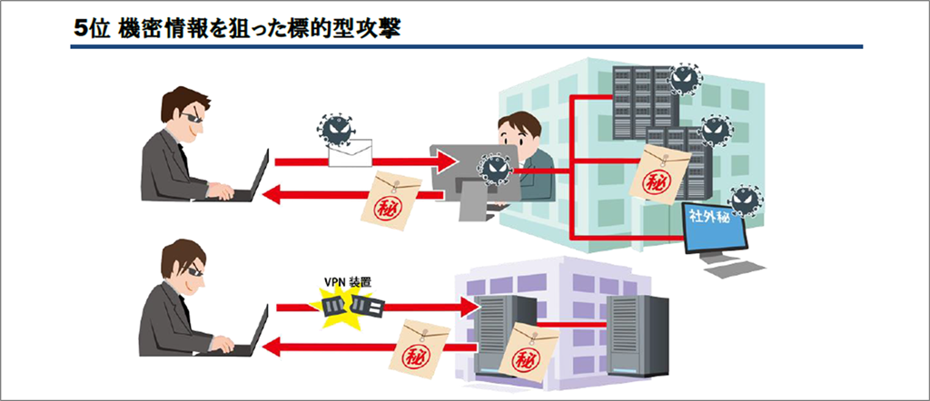 5位の機密情報を狙った標的型攻撃ですが、10年連続の選出となっています。特定の組織を狙ったサイバーエスピオナージ(サイバー諜報活動)であり、主に機密情報の窃取を目的としているとされています。