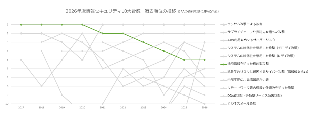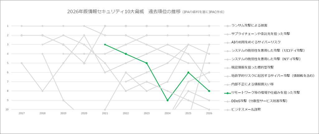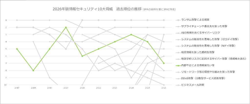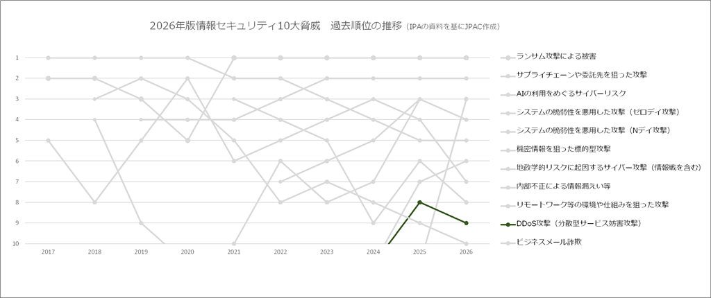 選出される10大脅威とその順位は毎年変動しています。上記グラフは2026年版で選出された10大脅威(組織編)の過去の順位の推移になります(脅威の名称は年によって若干の変化があるものもありますが、同一の脅威とみなしました)。