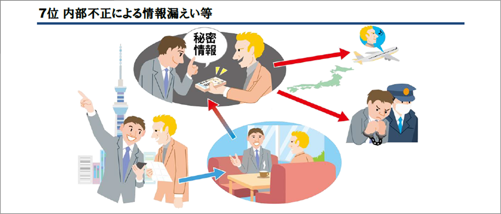 7位に選出された内部不正による情報漏えい等は、順位の上下はありながらも、10年連続で選出されている脅威です。内部不正は、意図的な場合と過失による場合があります。また、組織の従業員による場合だけではなく、元従業員や、アルバイト、委託先の関係者等による場合もあることに注意が必要です。
