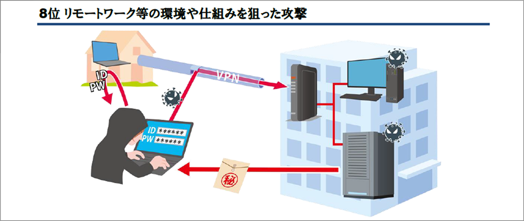 新型コロナウイルスの感染拡大により、急激にリモートワークの普及が進みましたが、それにともなって選出されたのがリモートワーク等の環境や仕組みを狙った攻撃です。以降、順位に変動がありつつも毎年選出されています。
