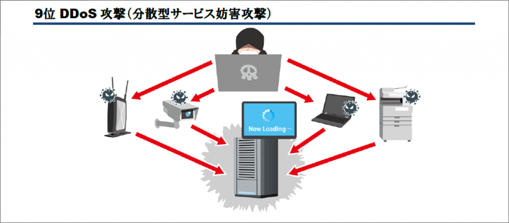 DDoS攻撃(分散型サービス妨害攻撃)は古くから確認されている脅威ですが、昨年、初めて選出されました。複数の機器を乗っ取り構成したネットワーク(ボットネット)から、WEBサービス等に対して一斉に大量のアクセスを仕掛けて高負荷状態にさせるといった攻撃です。それにより、サービスの停止等が発生する恐れがあります。